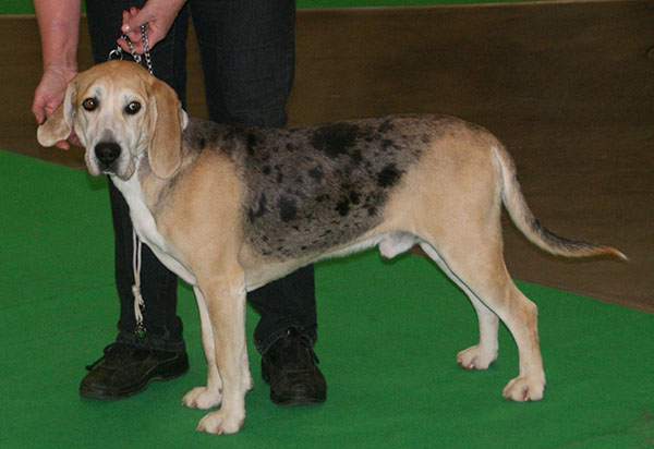 The Dunker is also called the Norwegian Hound and is medium in size with long, floppy hound ears. They tend to be a light fawn color with white markings and a very distinctive black or blue saddle with harlequin markings.