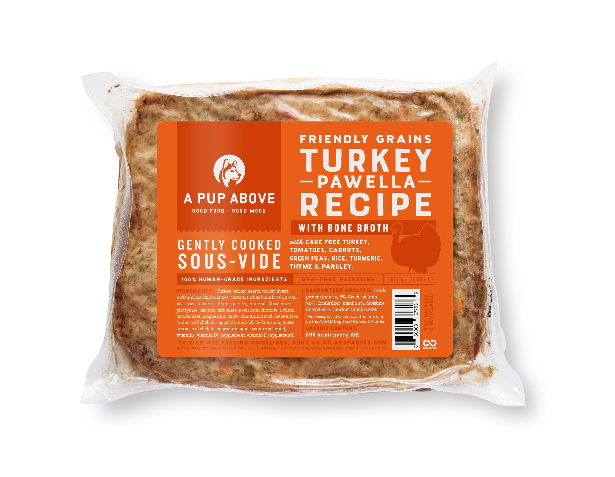 A Pup Above uses a French method called, “sous vide,” which involves slow-cooking the food in a vacuum-sealed bag under precise temperatures, thereby preserving the nutrients. The portions are then frozen and shipped immediately. The food is made in a USDA facility with 100% human-grade ingredients, it is free from added growth hormones or antibiotics, and the recipes have an average protein content of around 14%.