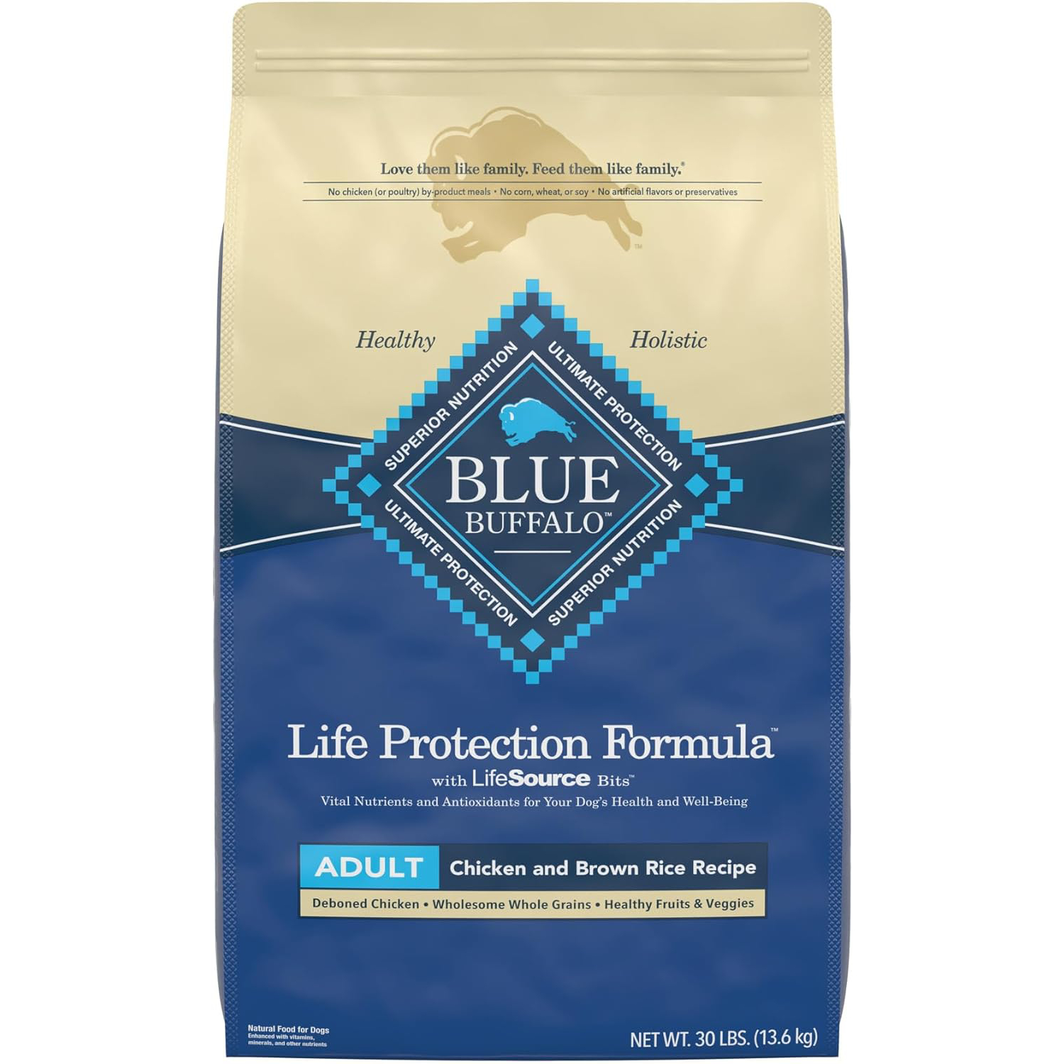 Blue Buffalo Life Protection Formula Adult Dry Food is one of the most popular standard dog foods for adult dogs. It has deboned chicken and chicken meal as its first two ingredients, and it contains other nutritious ingredients, like brown rice, barley, and oatmeal.