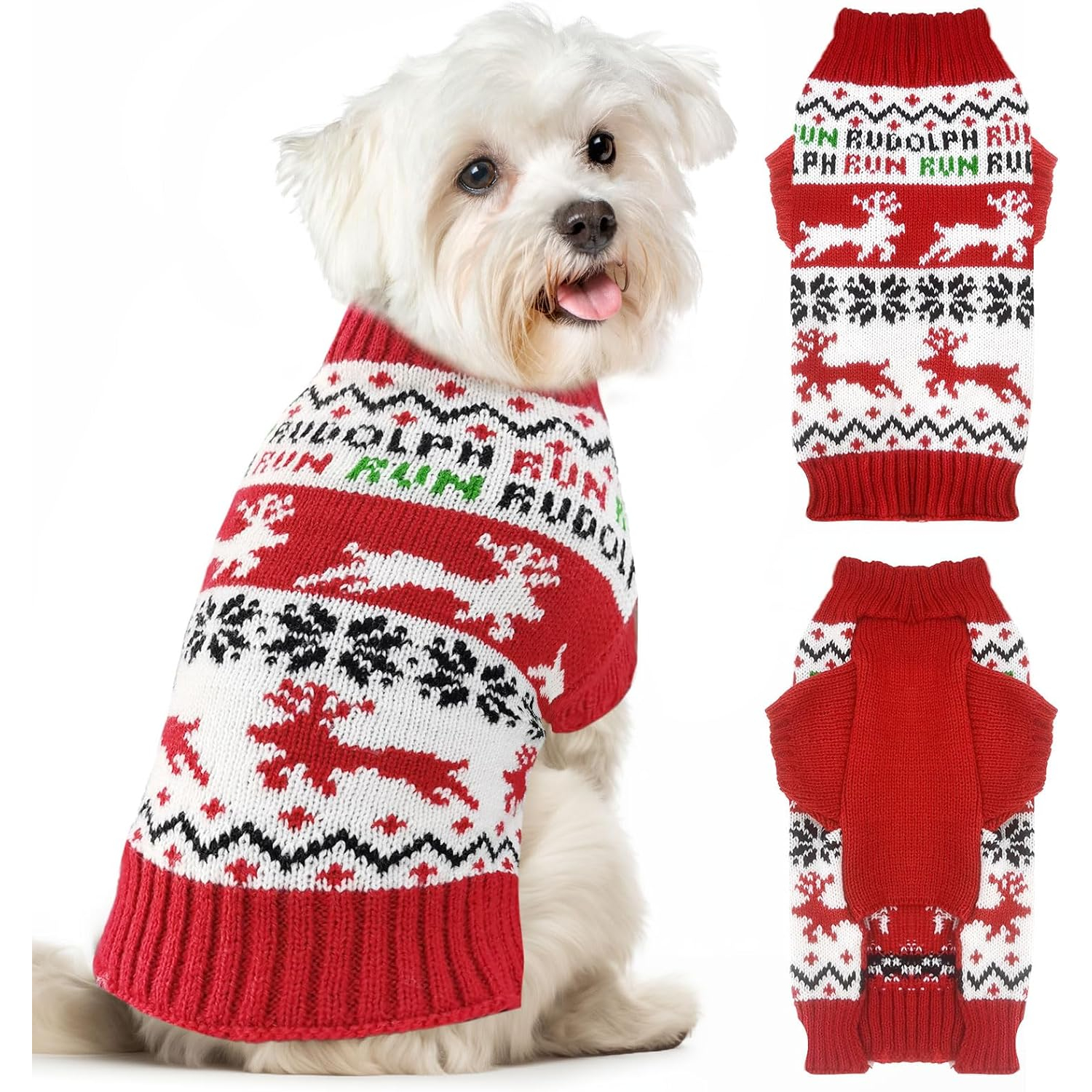 While there are a lot of Christmas sweater options for small and very small dog breeds, it can be more difficult to find options for bigger dogs. But there are plenty of big dogs that get cold in winter and that enjoy dressing up for the festive period. This 2-pack of Christmas sweaters is designed for large dogs. One of the sweaters is red and the other green, and they both feature an assortment of Christmas logos and images.